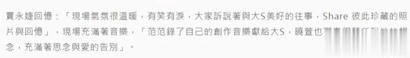 贾永婕回应媒体,称当天大家一起集聚到大S的家中,然后范范录了音乐为其送别,范晓萱则是为她弹奏送别钢琴曲。