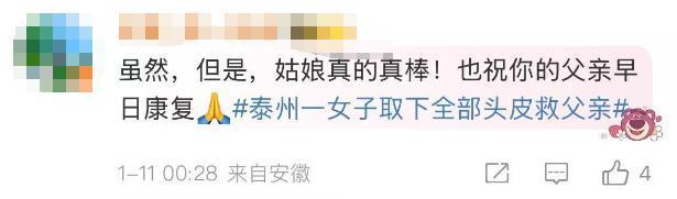 医生在病房内为取皮手术后的刘女士检查(图源:微泰州)据了解,大面积烧伤病人植皮,如果没有正常皮肤可以取,一般会取头皮,小面积烧伤病人植皮,一般会取大腿内侧。为减少排斥反应,一般是取病人自己的头皮,再次是近亲属的,再其次是用其他异体皮代替。取整个头皮一般是一片一片取,取一次后一星期左右可以再取,取皮深度一般到真皮层,会有明显痛感。网友们被刘女士的故事打动并纷纷送上了祝福"亲情可以浓烈到无法想象""希望女儿和爸爸都早日康复"
